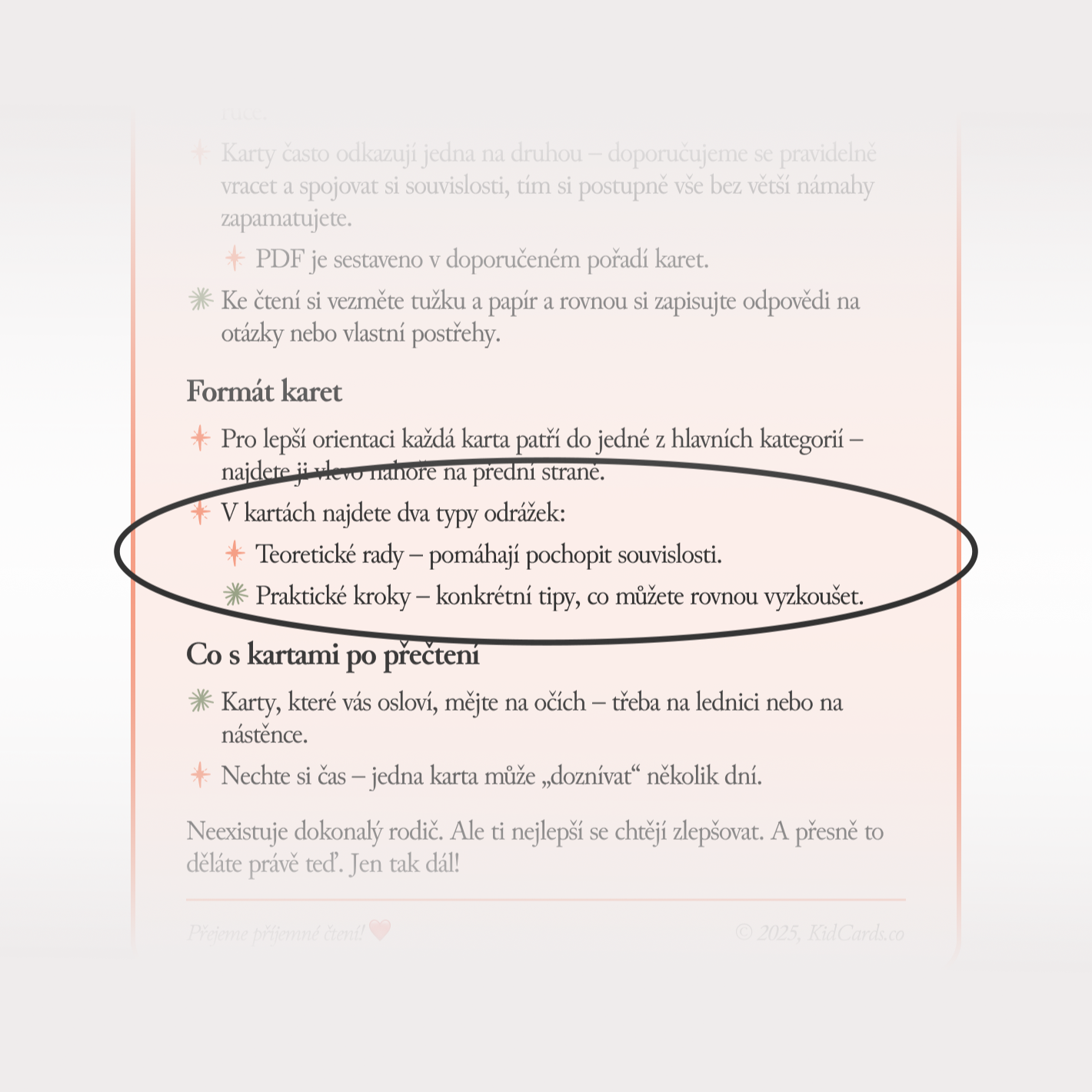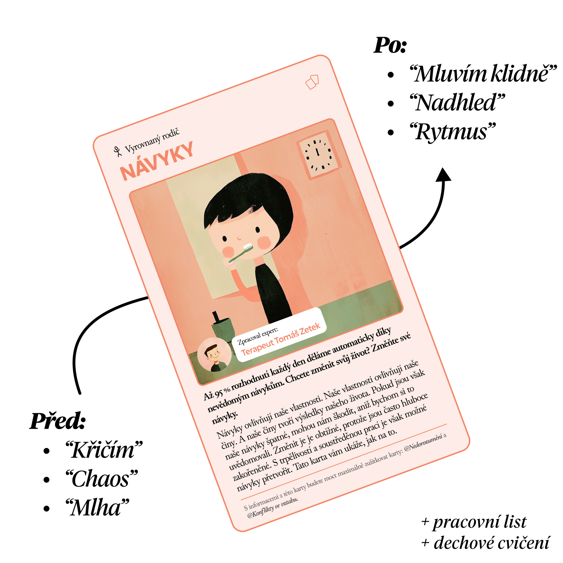 Vyberte si jednu kartu a mějte ji na očích – připomene vám, co je v dané fázi výchovy důležité. Pomáhá držet směr a neztrácet nadhled.